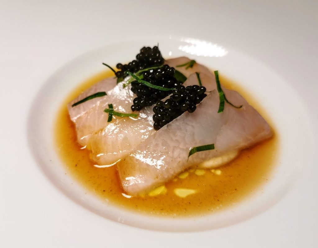 With jalapeño, “kaviari” gold standard Ossetra caviar, aged ponzu