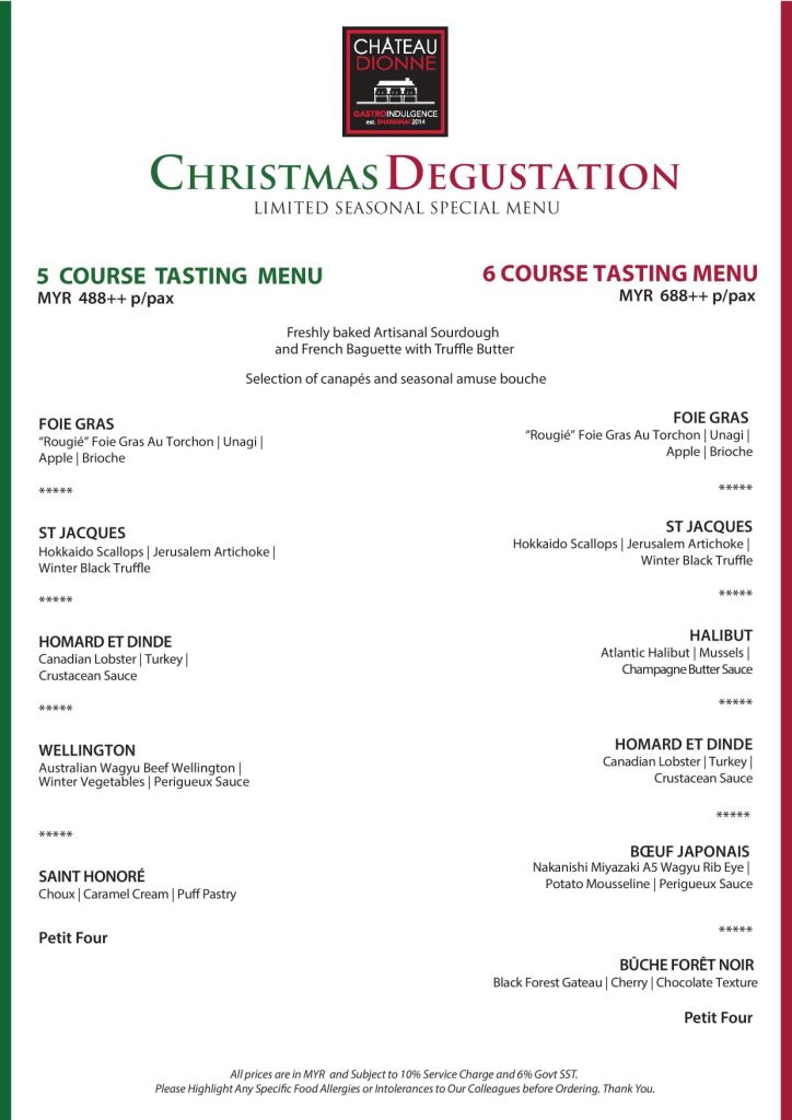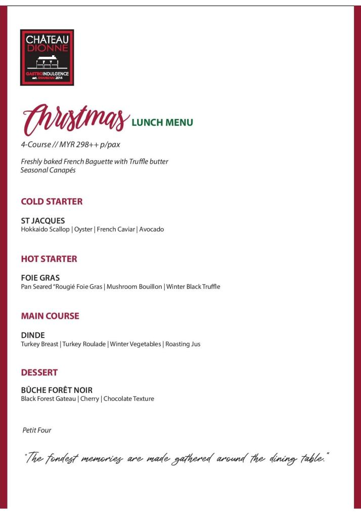 Executive Chef Andy Choy at Chateau Dionne Kuala Lumpur has prepared a luxurious spread of specially created festive dishes for this Christmas! The Christmas lunch tasting menu is available from 22 to 25 December 2020, while the Christmas dinner tasting menus are available from 19 to 25 December 2020.
