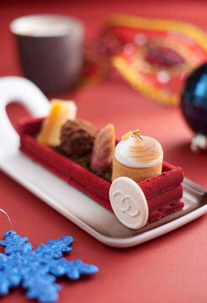 Among the festive desserts for this Christmas Afternoon Tea are Mini Chocolate Amaretto Yule Log, Red Velvet Macaron with Cream Cheese Frosting, Apple and Cinnamon Christmas Pudding, Green Tea Tart, Christmas Chocolate Fudge Cake, Raspberry Cheesecake, Christmas Cookies, Plain and Raisin Scones, Strawberry Jam and Clotted Cream. Accompanying the selection of bites is a comprehensive medley of teas, freshly brewed coffee and juices.