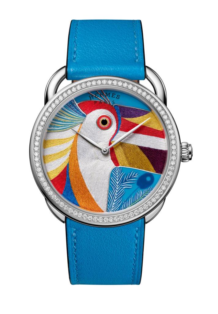 The Hermès Arceau watch weaves a colourful and singular tale in the guise of a radiant miniature enamel and silk thread toucan.