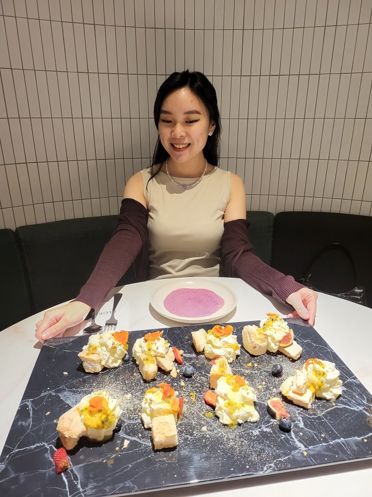 If you’re looking for a video for your Instagram feed then you have to order this deconstructed dessert which is presented tableside with some showmanship. The dessert itself is not overly sweet, with the pieces of meringue and cream balanced by the piquant fruits. This one can be shared by two dessert lovers, or three to four pax, or eight Tim Chews (I’m not a dessert person).