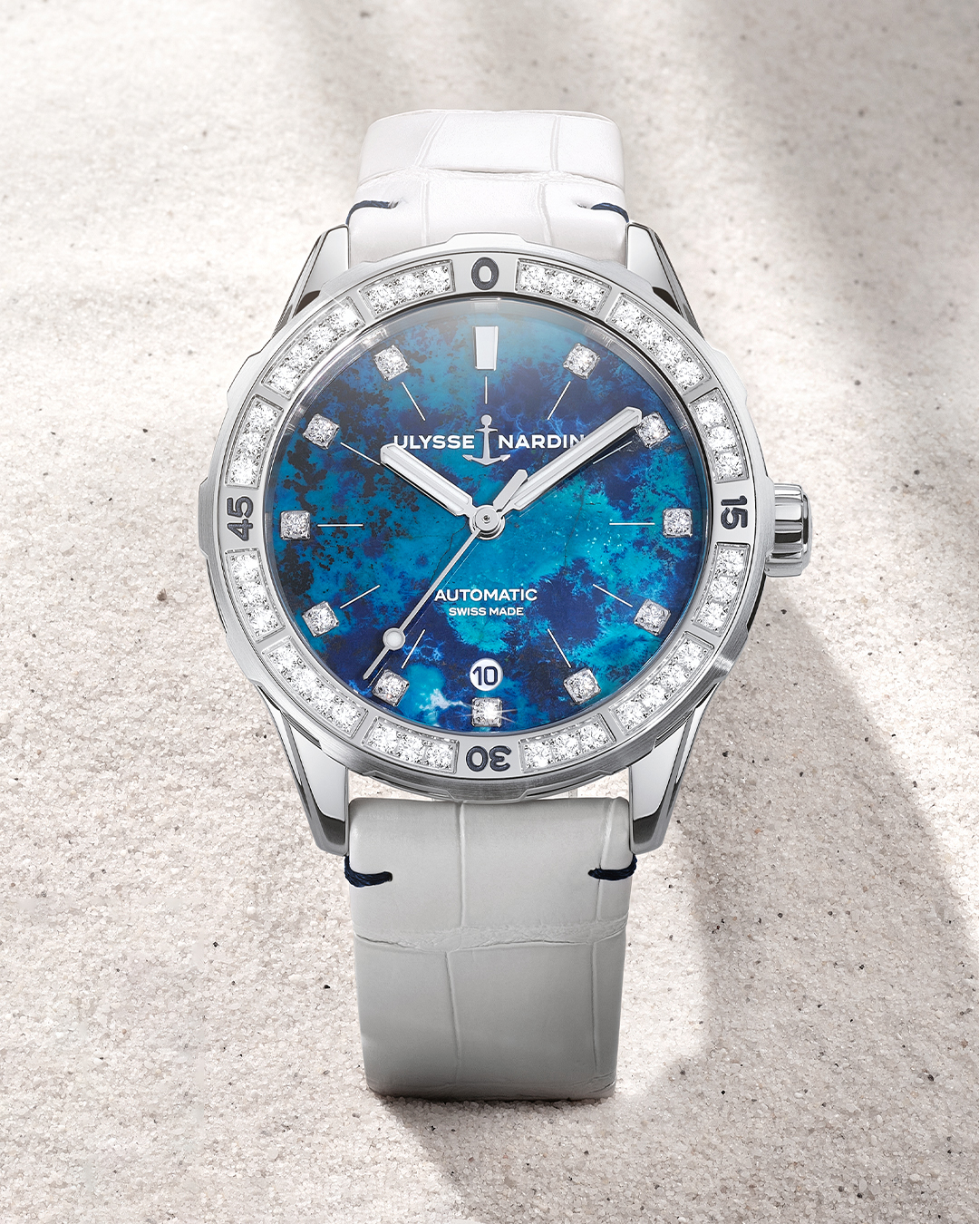 Housed in a sustainably crafted stainless steel case with polished and satin-brushed finishes, the Diver Atoll boasts a water resistance of 300 meters. To enhance its luxurious appeal, the bezel is adorned with 40 diamonds, while 11 additional diamonds embellish the hour markers. The watch is offered with a choice of a sporty white rubber strap or an elegant white alligator strap.