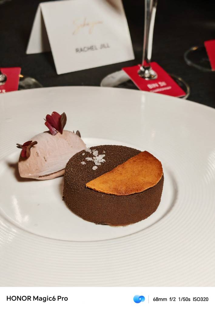 To conclude this extraordinary culinary journey, guests are treated to a decadent dark chocolate cremeux. This rich dessert is perfectly matched with the Penfolds Bin 138 Shiraz Grenache Mataro, a wine that draws inspiration from the Southern Rhône region. With its complex blend of Shiraz, Grenache, and Mataro, this wine offers a harmonious balance of fruit, spice, and tannin, providing a satisfying finish to the meal.