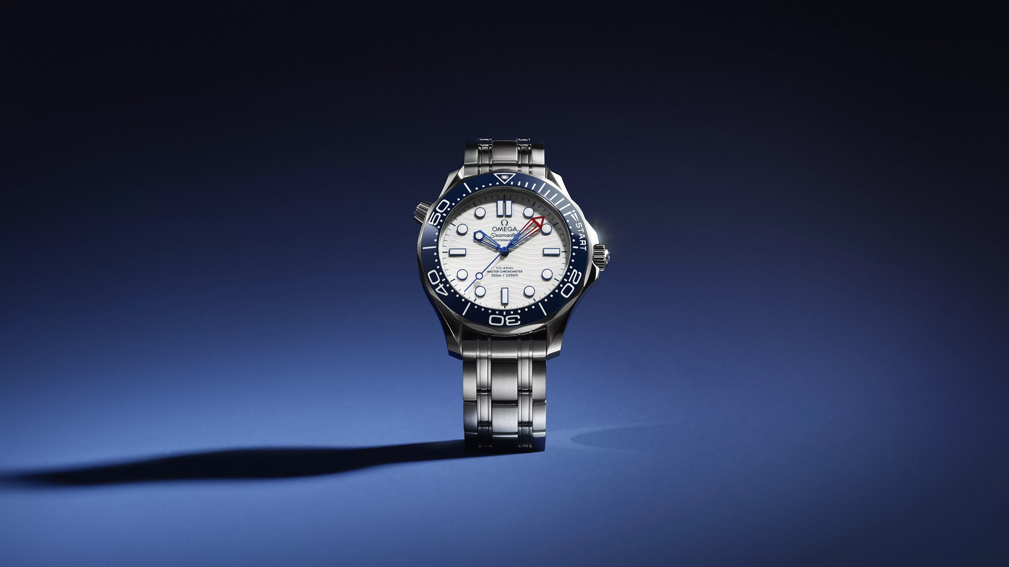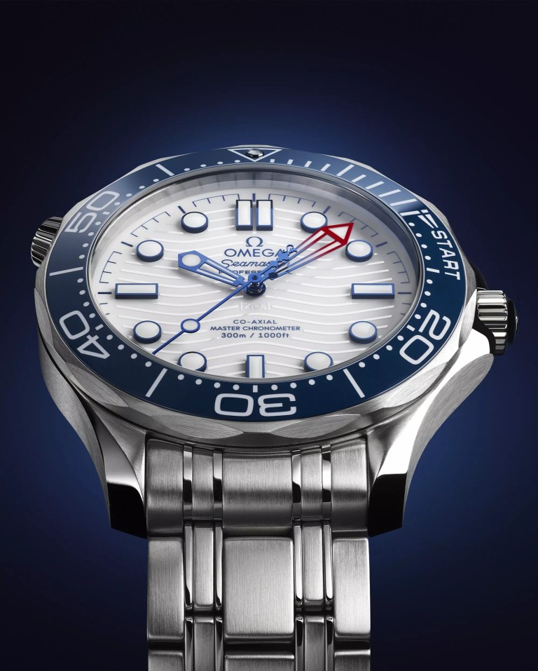 The new Seamaster Diver 300M America’s Cup edition is a 42 mm stainless steel masterpiece that combines the robust functionality of a dive watch with specific features tailored for competitive sailing. The watch boasts a blue ceramic unidirectional bezel with a regatta scale, featuring two 5-minute pre-start sections and a START section adorned with a regatta-inspired flag.