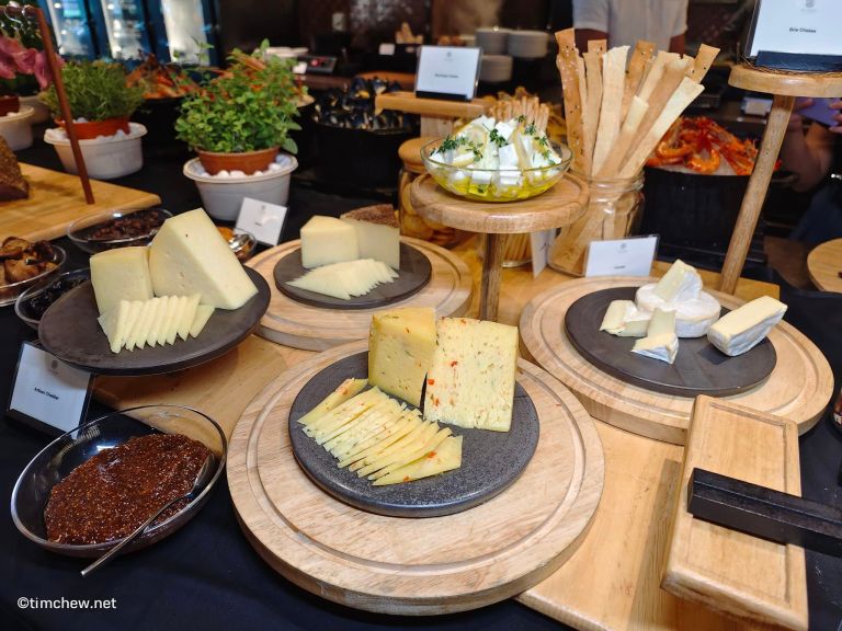 Dessert options include an array of elegant treats such as an eclectic selection of chocolates, Chocolate Eclairs, Hazelnut Financier, Vanilla Panna Cotta with pineapple, and Earl Grey Blackcurrant Cake. For those who prefer to end your meal wth cheese instead of sweets, the Cheese Station presents a decadent selection of Brie, Manchego, and Artisan Cheddar, accompanied by an assortment of nuts, fresh fruits, and artisanal crackers, perfect for pairing with wine.
