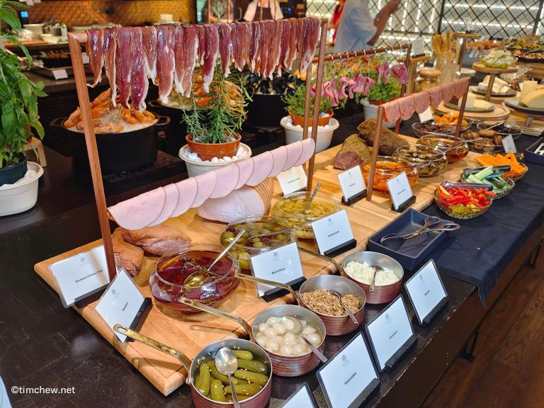 The Japanese Counter features a selection of sashimi, nigiri, and maki, including delicate slices of Salmon and Tuna Sashimi and intricate rolls like California Maki and Chuka Wakame Seaweed Salad. The beautifully laid out Charcuterie section offers premium Bresaola, Smoked Duck Breast, and Beef Pastrami, served with gourmet mustards and pickles.
