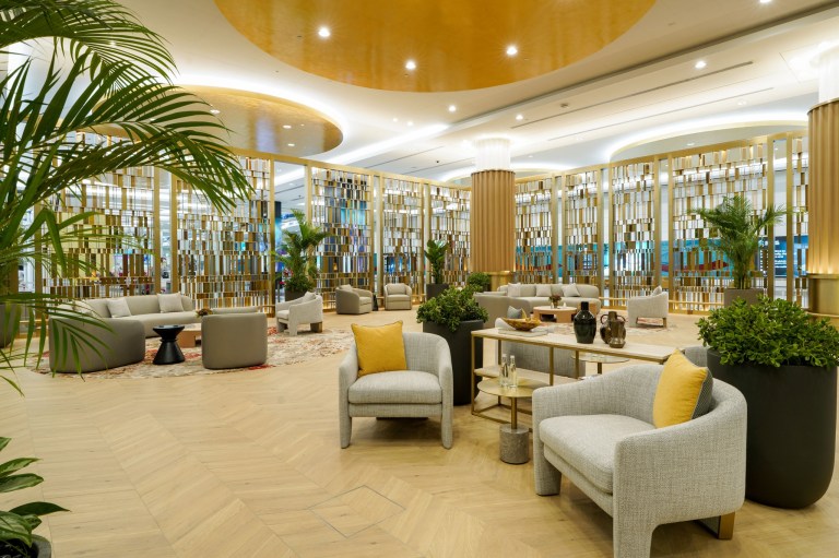 Every aspect of the Emirates First space has been crafted for premium comfort. A grand golden entryway welcomes guests into a serene environment warm with earth tones, bronze, and gold. The area is “both visually relaxing and luxurious to the eye, offering a serene escape from the hustle and bustle of the airport.” Grand columns, a mix of wooden and marble flooring, plush armchairs, and an extravagant fresh flower arrangement channel the ambience of Emirates’ renowned First Class Lounges. In tribute to the UAE, a backlit Ghaf Tree is featured as a centerpiece, while iconic Emirates Rolex clocks display times for major world cities.