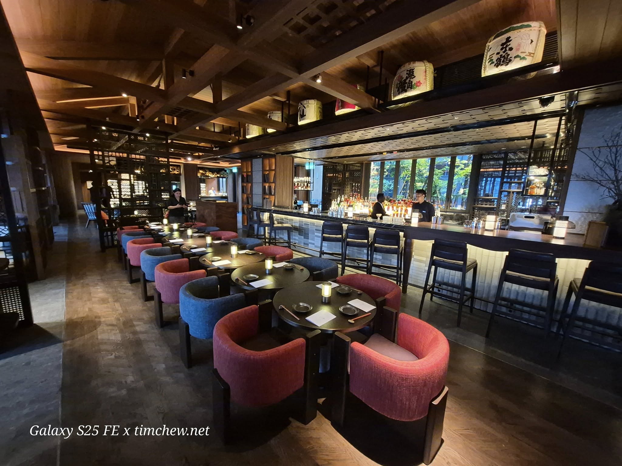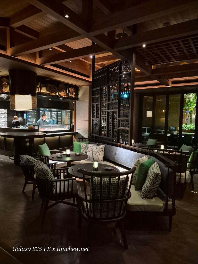 The courtyard provides a quieter alternative. Designed as a tropical garden with Japanese influences, it centers around a 30-year-old bonsai tree and incorporates water features that add what the restaurant describes as a “Zen-like serenity.” As the evening progresses, an in-house DJ adjusts the atmosphere throughout the venue, gradually shifting the space from a dinner venue to a more social environment. The music, combined with the energy from the show kitchen and the activity at the bar, creates a dynamic that evolves as the night unfolds.