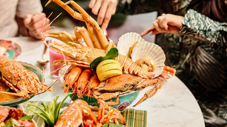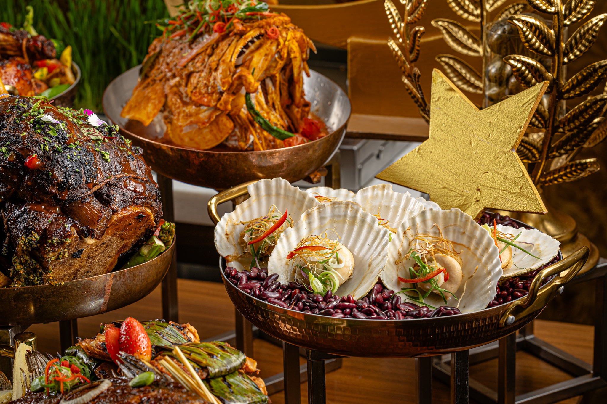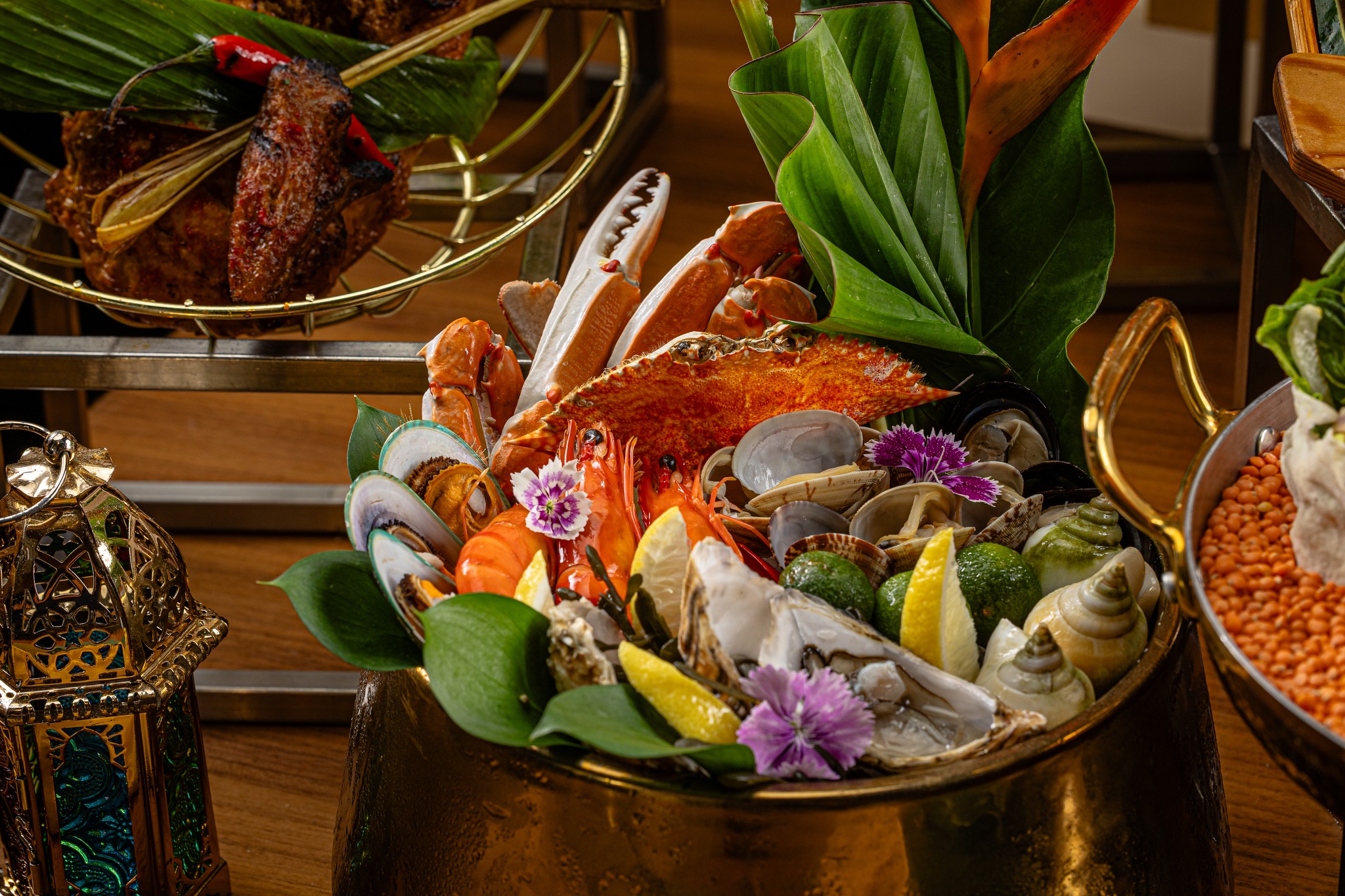 The spread at Vasco’s runs to over 180 dishes across the buffet period. Guests can expect a strong lineup of starters including Golden Snapper Otak-Otak with Passion Fruit Salad, Homemade Urap Daging Pekasam, and a Young Mango Salad with Dried Scallops. The seafood section — featuring ASC-, BAP-, and MSC-certified selections — spans Oceanic Bounty on Ice, Pan-Seared Sea Bass, and Flower Crab Masak Lemak Nenas.