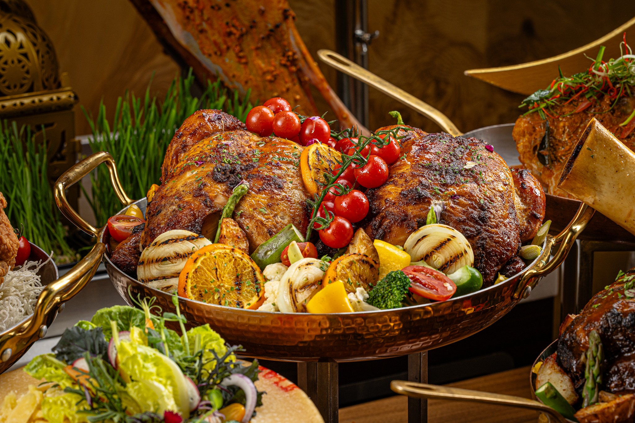 Live stations bring theatrical flair to the dining floor, with Golden Snapper Fish Head Curry, Lebanese Shawarma, Grilled Scallops with Ginger Garlic Chili, Australian Wagyu Bolognese, Murtabak Angus, Lamb Gear Box, and a Royale Caesar Reef Lobster Caesar Salad all vying for attention. Carving stations meanwhile present HALAL-certified Australian Whole Lamb with Moroccan Chermoula, 6-hour Slow-Roasted Venison Timorensis, and the returning crowd favourite — Lambassador Smoked Paprika Beef Shank.